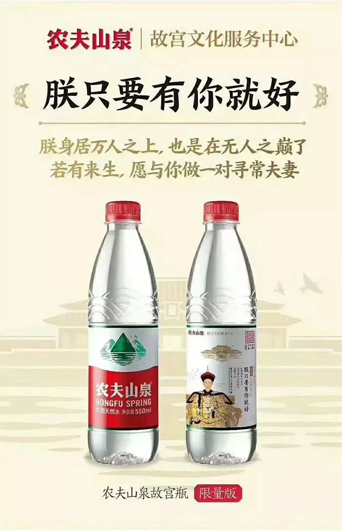 2018年,農夫山泉又跟大熱門故宮合作,聯名故宮推出了朕打下的“一瓶江山”限量款,這一次農夫山泉聯合故宮文化服務中心推出了9款限量版的“故宮瓶”,瓶身上設計了不同的人物,主要以康雍乾三代帝王的人物畫像以及嬪妃為背景,並且搭配了貼合人物歷史背景的文案,使得曾經高高在上的封建君王也走下神壇,增添了一絲人味。
