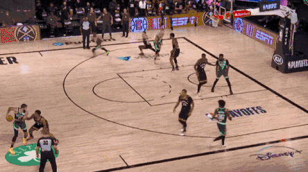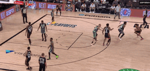 綠軍首節進了5個三分,4個在底角,還有一個是沃克突破進來打到弱側的杰倫-布朗投進的。他們全場投進19個三分,11個是在兩側底角的區域。