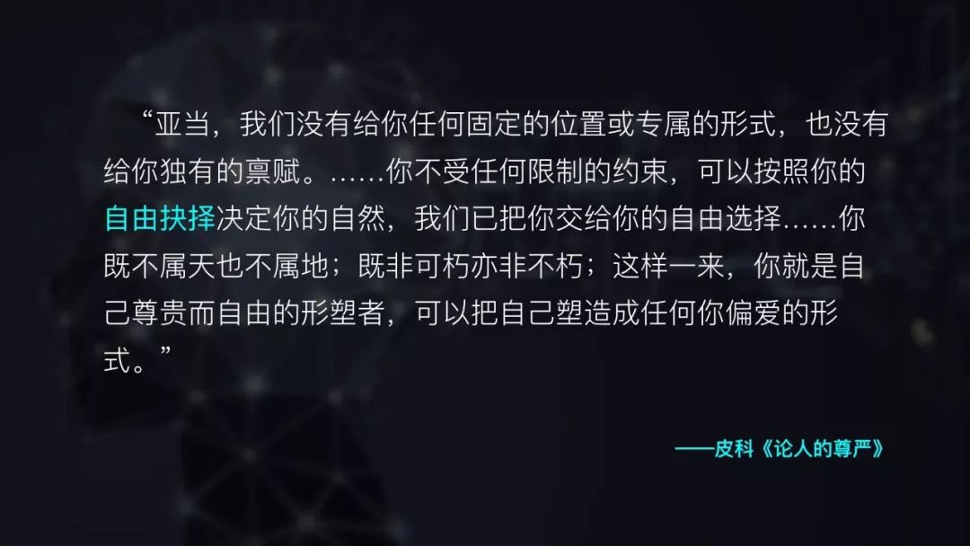 所以我找了一段話,這段話來自於文藝復興時期的一位意大利哲學家皮科。他有一本書叫作《論人的尊嚴》,他當然是用一種有神論的口吻,以上帝的視角來對亞當説話,他這句話意味非常深。大家看一下: