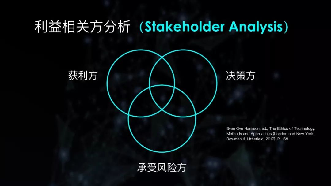 所以我引用了一位西方學者提出的分析框架,叫做利益相關方分析(Stakeholder Analysis)。就是把跟技術創造有關係的人大致分為三類:技術的獲利方、技術的決策方、技術風險的承受方。這三個圓圈正好可以畫出7個象限。