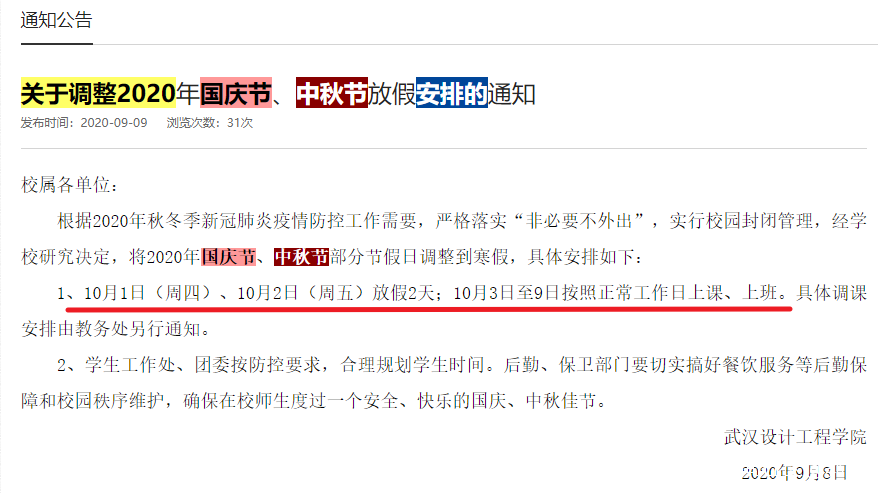 多所高校通知!中秋、國慶只放假一天…_風聞