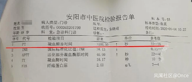 很快,臨府莊16人都被診斷為凝血功能障礙,檢驗報告顯示:正常情況下的數值是9.4—12.5,有的患者現在已經達到了129.1,超過了正常值的10倍以上。