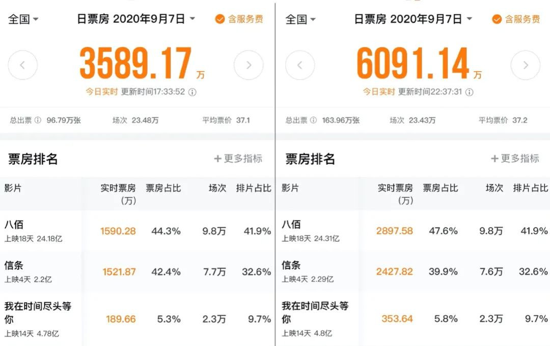 以9月7日為例,燈塔專業版所顯示,當天的預售票房只有800萬左右;到了當天下午17時30分,全國票房收入為3589萬;而截至當天22點,全國總票房已經突破了6000萬。由此可見,在工作日當中,真正有計劃提前買票的觀眾是少數,更多觀眾是在閒暇時臨時選擇買票觀影的。因此在出校時間不確定的情況下,大學生的衝動型觀影人羣也會有不少縮減。