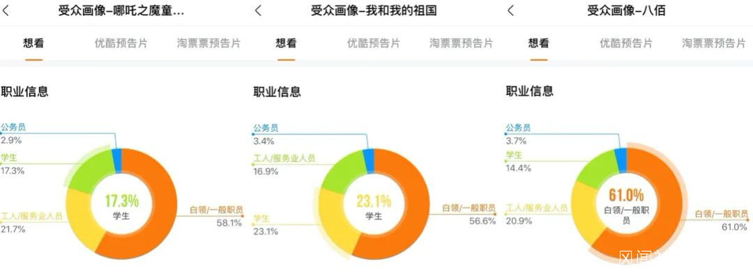 目前雖然沒有公開數據統計顯示在校大學生用户在市場裏的具體佔比,但通過對幾部熱門影片的受眾畫像分析就可以看出,該羣體的力量是不容忽視的:燈塔數據顯示,影片的“想看人羣”畫像裏,《哪吒之魔童降世》的學生佔比為12.74%、《我和我的祖國》是15.99%、《八佰》則為14.66%。而考慮到中小學生的購買力相對有限,大學生應該是這一人羣的主要構成。