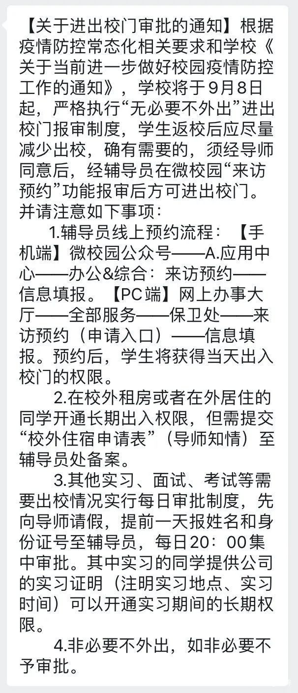 包括武漢體育學院在內,武漢一些學校採取的是完全封校制,禁止學生外出,具體何時解封暫沒有明確消息;包括西安外國語學院在內,西安等地的一些學校則採取限制外出制度,每班每週可以有一定額度的“外出資格”,學生需要提前向輔導員申請;而包括北京大學、中國傳媒大學在內,許多高校採取的則是申報制度,學生有合理需求則可以在小程序上申請出校,由輔導員進行審批。