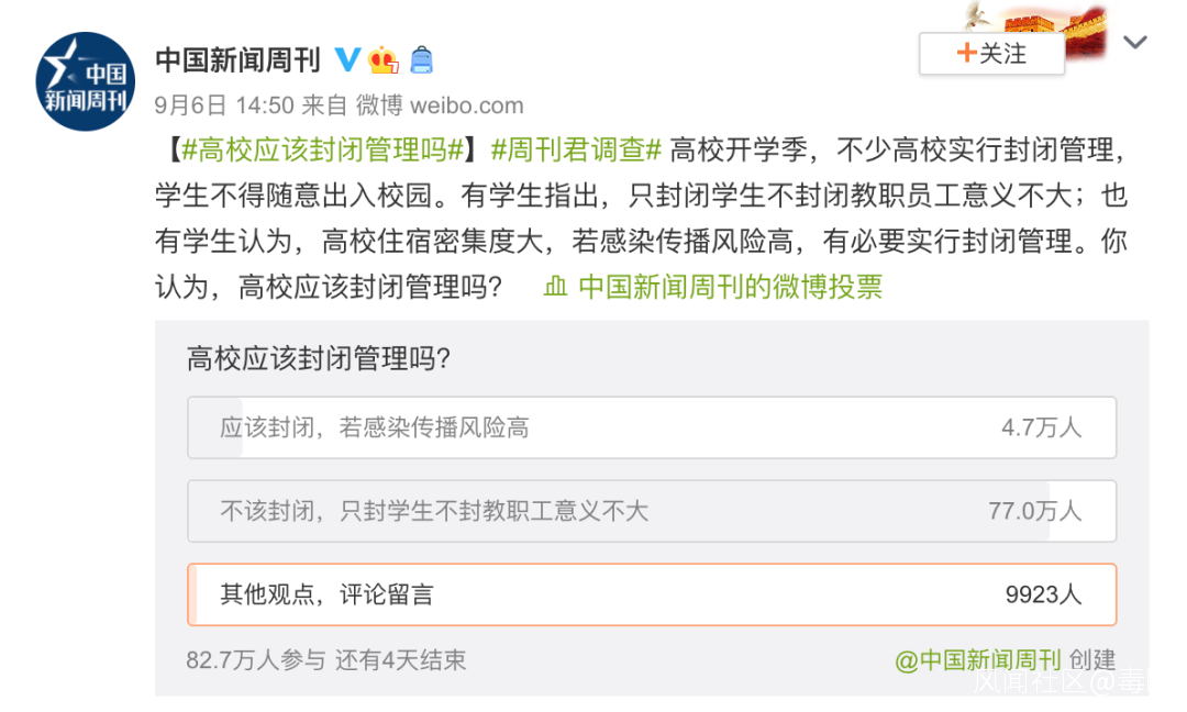 針對這些相關要求,《中國新聞週刊》在微博上發起了一項投票調查,其中有77萬受訪者投票認為高校“不該封閉”,僅有4萬人認為應該封閉。調查數據懸殊的背後,除了學生們對於相對寬鬆的校園管理的訴求外,也折射出了各行從業者對於相關連鎖反應的擔憂,其中就包括剛剛復工不到兩個月的電影產業。