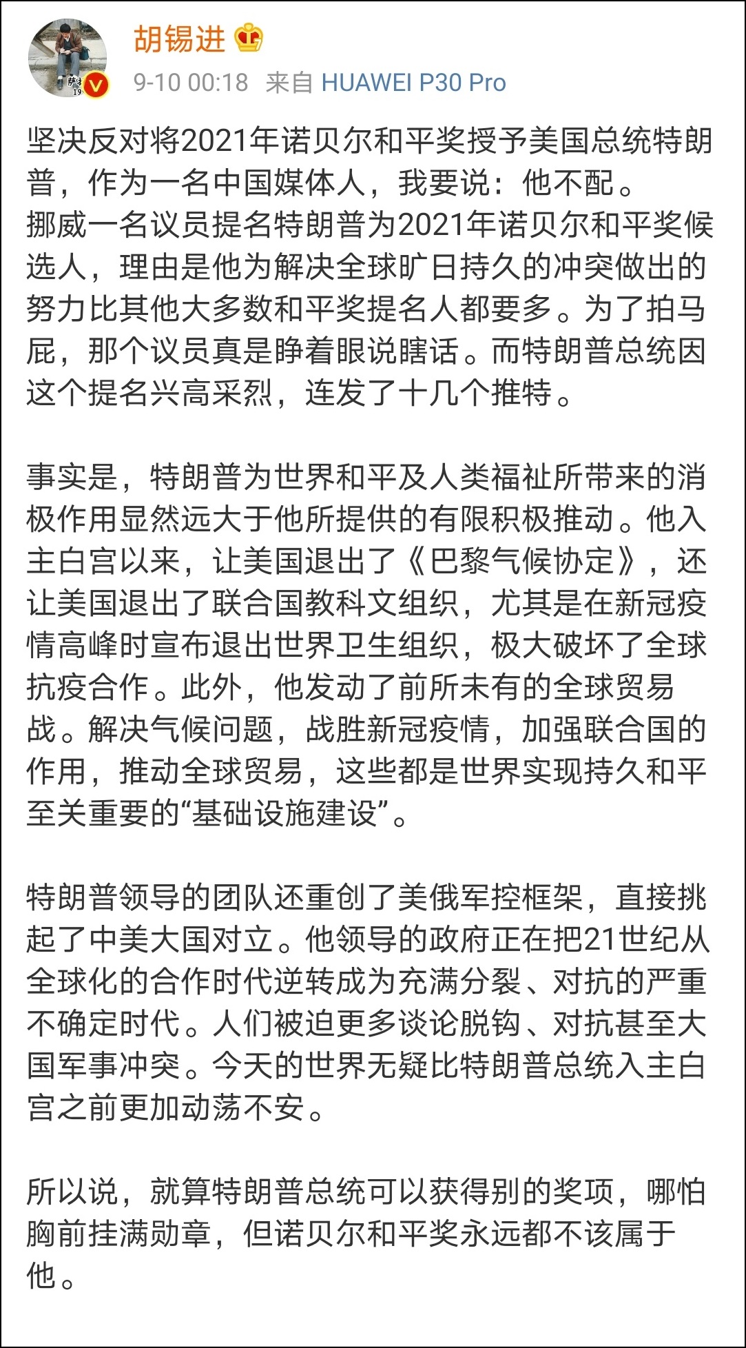 而環球時報總編輯胡錫進也在國內外社交媒體上發文評論此事,稱自己作為一名來自中國的媒體人,堅決反對將2021年諾貝爾和平獎授予特朗普,很簡單的理由:他不配。