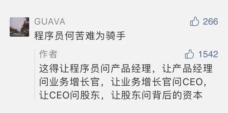 有人回答他:這你得讓程序員問產品經理,讓產品經理問業務增長官,讓業務增長官問CEO,讓CEO問股東,讓股東問背後的資本。