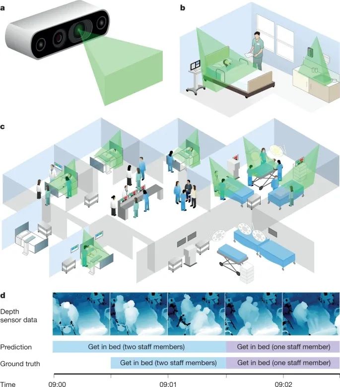 圖d是把對活動的預測和深度傳感器收集的數據進行比較。頂部是深度傳感器收集的數據,中部是算法預測的病人的活動情況、持續時間和所需的協助患者的人員數量,底部是根據監控影像人工標註的實際情況。