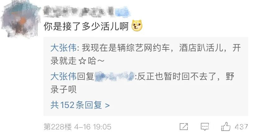 據不完全統計,截至9月前,大張偉2020年共在11檔綜藝裏露了臉,他也在微博上戲稱自己是“綜藝網約車”:“酒店趴活兒,開錄就走。”