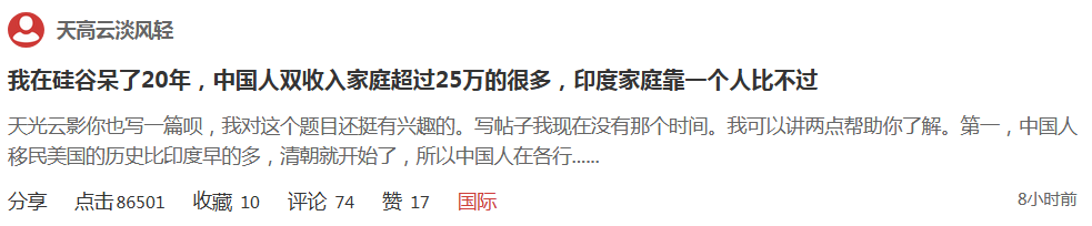 《我在硅谷呆了20年,中國人雙收入家庭超過25萬的很多,印度家庭靠一個人比不過》——天高雲淡風輕
