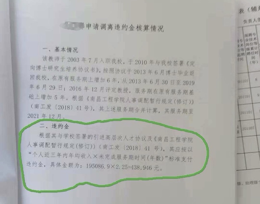 9月8日,南昌工程學院馬克思主義學院教授胡寧(化名)向記者反映,他在博士服務期滿後提出離職時,被南昌工程學院索賠違約金43.8946萬元人民幣,校方給出的理由是:博士服務期滿了沒有違約,但評上教授的5年服務期還沒滿,算違約。