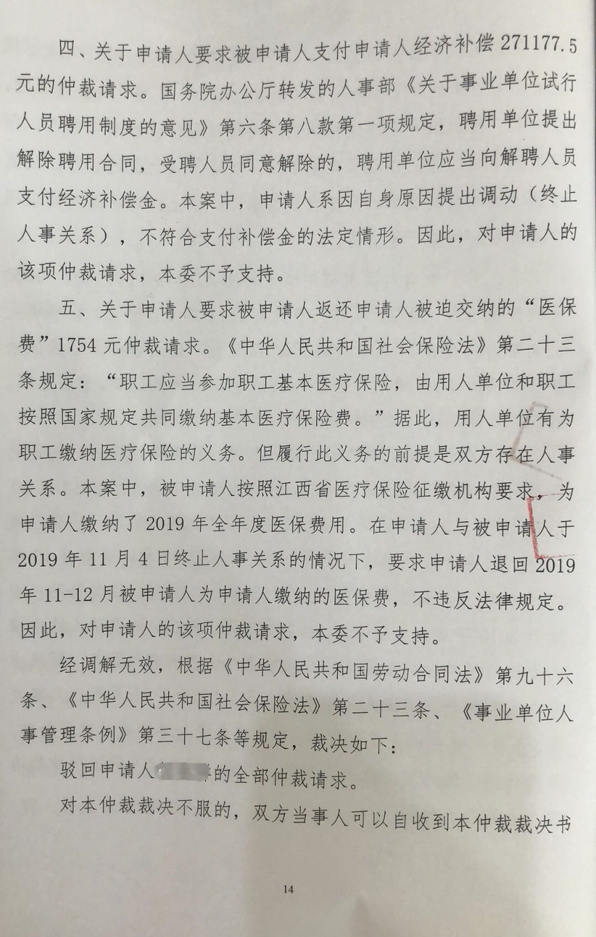 對此,校方卻有不同的解釋。《江西省勞動人事爭議仲裁委員會仲裁裁決書》【贛勞人仲字[2020]第399號】顯示,南昌工程學院對此辯解稱,胡寧為了順利調往省外高校而選擇承擔違約責任並主動交付違約金,卻在校方為其辦理調離手續成功調至某大學後,主張交付違約金受到脅迫等理由要求返還。胡寧完全是自身原因主動要求調往省外,其主張學校脅迫、單方面決定解除人事關係完全強詞奪理。