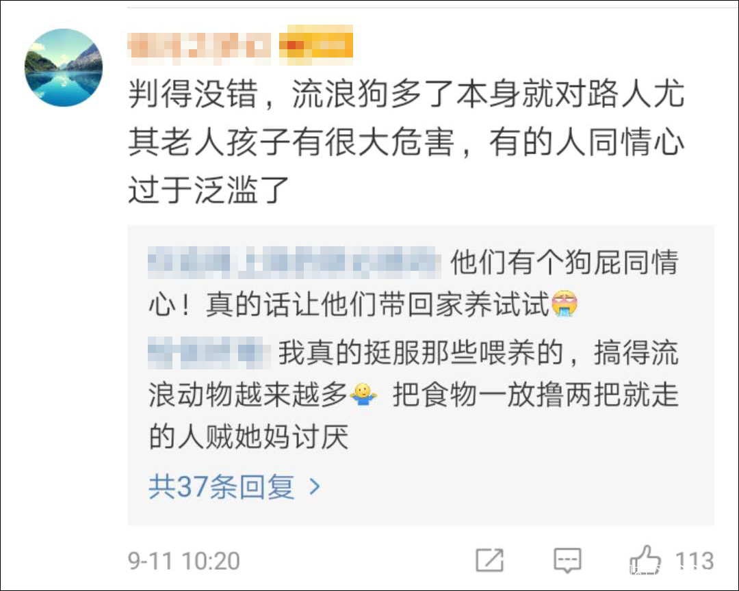 不過也有網友支持法院的判決,他們認為像這種“愛心投餵”都是“偽愛心”。流浪狗過多,這些投餵者也有責任,正確的做法應該是要麼帶回家養,要麼送到貓狗收容中心。
