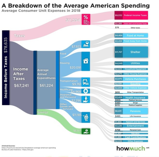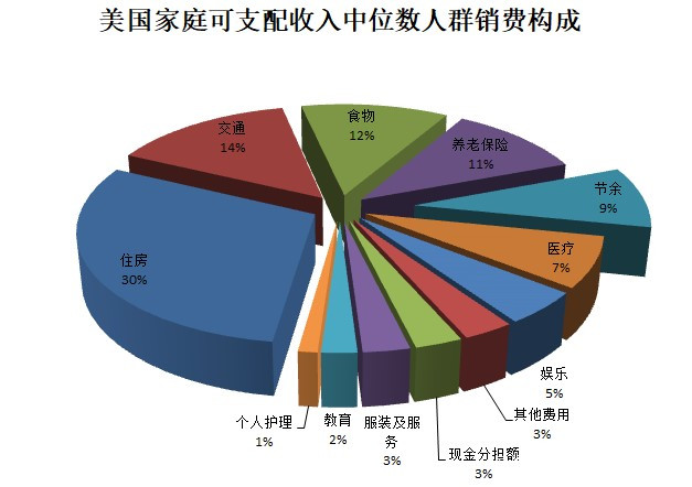 美國家庭中位數收入人羣主要消費結構如下:居住30%、交通14%、食物12%、養老保險11%、醫療7%、娛樂5%、服裝3%、教育2%……節餘9%。