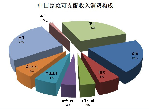 中國對於中國家庭消費報告較少,找到一份關於2013年中國家庭消費構成的研究文章,其分項有所不同,但可以參考,其中居住佔27%、食物21%、交通通訊6%、教育文化6%、服裝5%、醫療4%、家庭用品4%、其他1%、節餘26%。