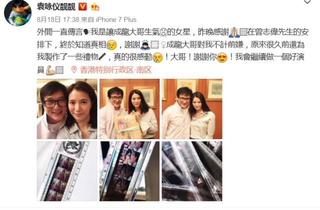 直到 2017 年的一場飯局上,袁詠儀與成龍再度相聚,兩人一笑泯恩仇,成龍還送給袁詠儀電影《霹靂火》的底片作為禮物。