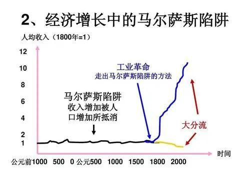 這就是著名的馬爾薩斯陷阱——人口增長是按照幾何級數增長的,而生存資源僅僅是按照算術級數增長的,多增加的人口總是要以某種方式被消滅掉,人口不能超出相應的農業發展水平。