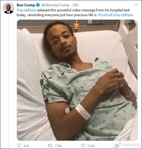9月6號,被警察從後背近距離連開七槍的美國黑人雅各布·布雷克在病牀上錄製視頻,講述了自己的病痛,以親身經歷呼籲人們珍惜生命,好好活下去,因為在美國,每個人的生活都可能像他這樣被奪走。