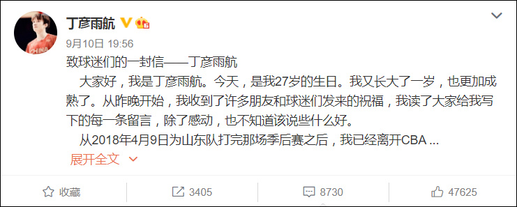 9月10日晚,也就是丁彥雨航生日當天,他在微博發表長文,表示最近兩年,自己一直在和傷病作鬥爭。