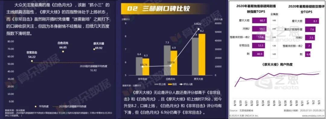 從口碑來看,暑期檔《摩天大樓》《穿越火線》《隱秘的角落》三部劇集的豆瓣評分都達到了8分以上,更相似的是,這三部劇集開播後走得都是“低開高走”的曲線,這也説明“內容為王”正在成為劇集市場的大勢,未來,劇集依靠內容質量實現熱度和口碑雙突破的概率將進一步提升。