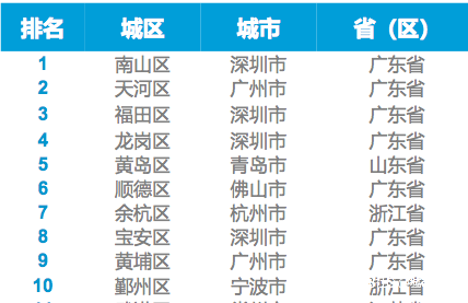 如果只看前10名,這個榜單幾乎被廣東省承包,共有7個區上榜,其中深圳佔4個(南山、福田、龍崗、寶安),廣州2個(天河、黃埔),佛山1個(順德)。