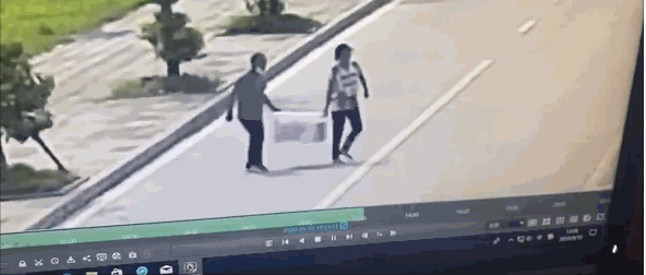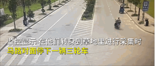 同時,馬路對面停下一輛三輪車,車上一對男女徑直走向箱子,打開蓋子看了一眼就把箱子抬走了。