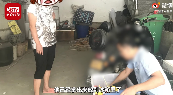 拿走箱子的村民夫妻表示,因為裏頭的東西看着像火腿腸,於是就放在了冰箱,打算等孫子放學回來後給他吃。