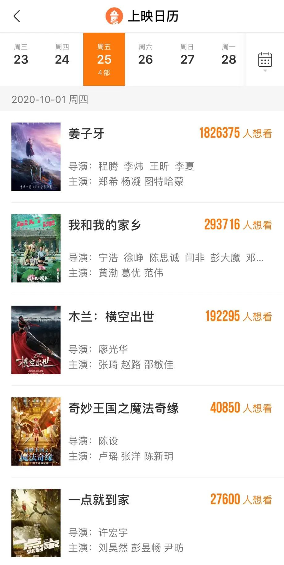 截至毒眸發稿前,一二梯隊的電影都保持了不錯的映前熱度:“搶跑”的《奪冠》,目前在淘票票上擁有192.8萬的想看指數,一躍成為了目前9月熱度最高的影片;同樣原本屬於今年春節檔影片的《姜子牙》和《急先鋒》則分別擁有182萬、63萬的想看指數;羣星薈萃的《我和我的家鄉》,目前想看指數為29萬。