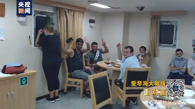 獲救人員紛紛詢問船員是哪裏人,當得知船員們來自中國時,他們豎起大拇指。隨後,41名落水人員被成功轉移到OCEAN ANG號散貨船上。船艙內,船員們將自己的餐食讓給了獲救人員,船長張輝立即安排船員為獲救人員檢測體温,按照防疫要求發放口罩,為受傷人員進行基本的傷口處理。晚上10點多,41名獲救人員被轉移到希臘海岸警衞隊的船隻上,持續五個多小時的救援圓滿結束。