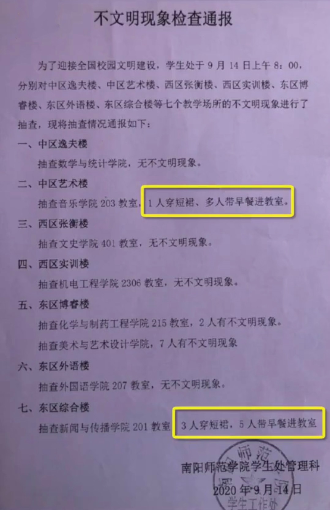 近日,河南南陽師範學院公佈的一則文件《不文明現象檢查通報》引發輿論關注。