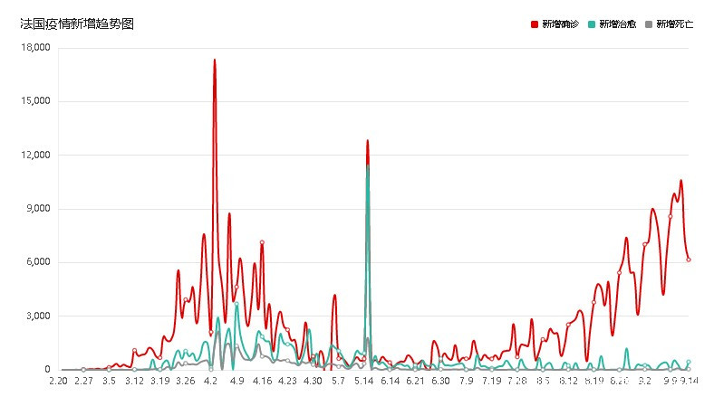 然後是老牌法國第二。老牌法國也在鬧各種罷工、自由、反智,經濟恢復強勁的同時新冠新增也紮實穩步重回巔峯~ 法國至今累計報告新冠確診病例38萬7千多,最近一週每日新增至少6000,至多10000 。記住是每日新增。