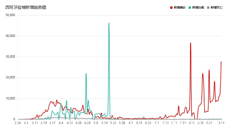 先是歐洲頭號強國西班牙。為什麼頭號強國呢?因為西班牙不限制美國人旅遊入境。緊跟燈塔那自然是強中強啦~ 西班牙至今累計報告新冠確診病例59萬多,最近一週每日新增至少8400,至多27000 。記住是每日新增。