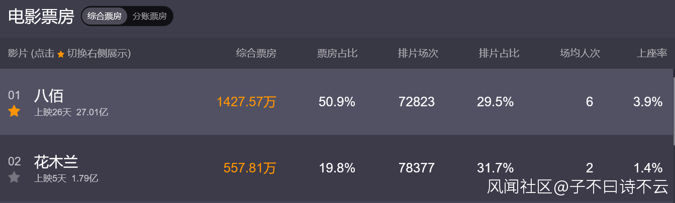 上映5天,《花木蘭》票房為1.78億,上座率和單日票房等數據均低於已經上映26天的《八佰》。