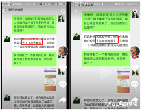 這條視頻同樣以微信聊天對話的形式編排,其中一個被備註為“深圳 李律師”的人建議借款人去“飛虎大數據”查詢負債和信用。