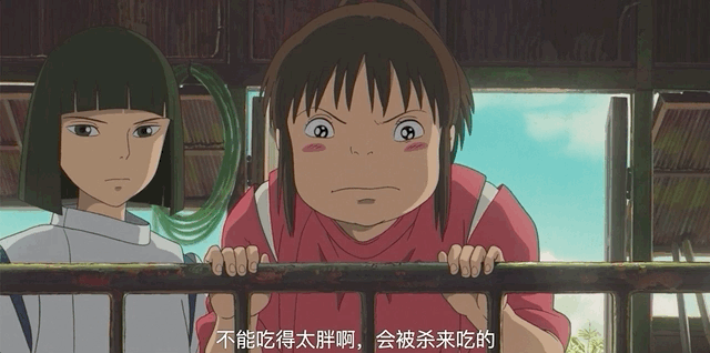 千尋的爸爸媽媽在大快朵頤後變成了豬,降格為“吃太多會被殺掉哦”的表情包。