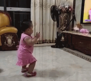 穿着粉色連衣裙的她,跟着電視裏的畫面,拍着手上下搖擺。