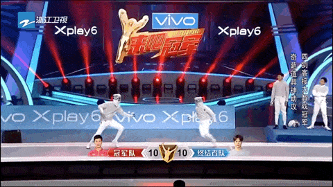 《來吧冠軍》中和奧運冠軍雷生進行擊劍對抗(右側王嘉爾)