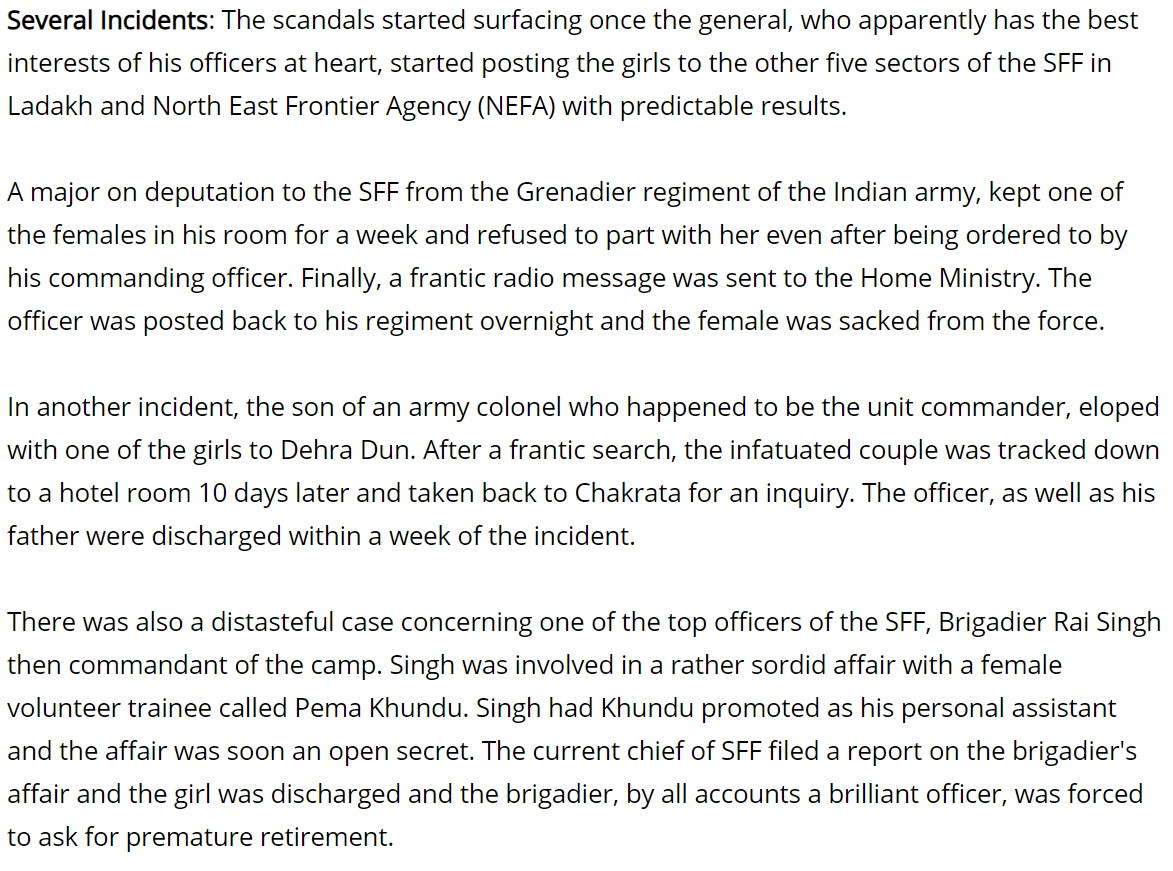 還有一個令人反感的案件涉及SFF一名高級官員,當時是營地指揮官的萊格·辛格准將。辛格(Singh)與一位叫Pema Khundu的女志願者見習生私通。辛格(Singh)將Khundu晉升為他的私人助理,而這件事很快就成為公開秘密。 SFF現任局長就該准將的婚外情提出了一份報告,女孩被解職,而該準據説是一名出色的軍官,被迫要求提早退休。