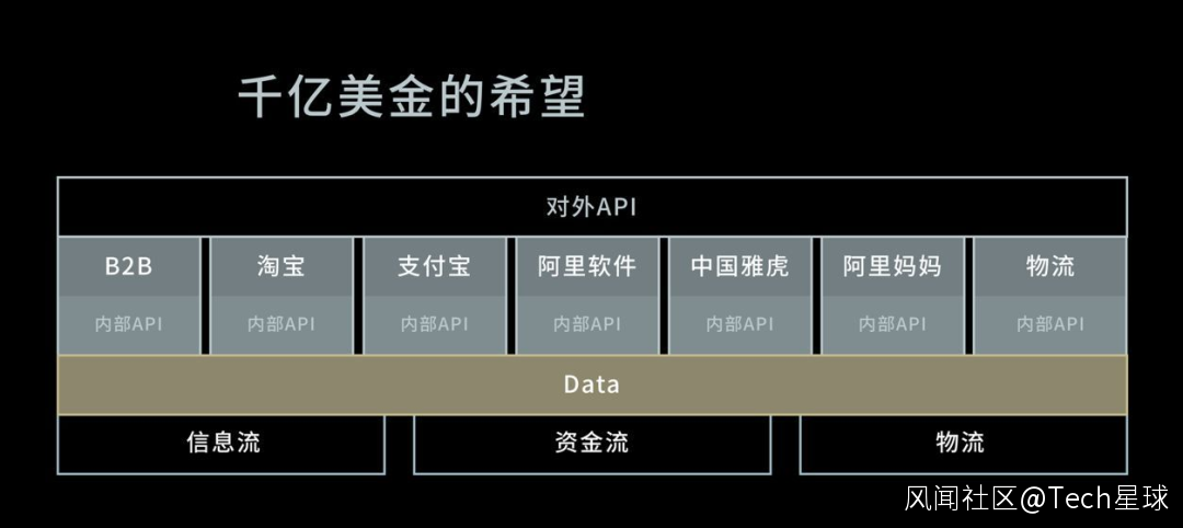 這張圖透露的信息就是,阿里要把流淌在各個業務部門的數據打通,讓信息流、資金流和物流形成統一的數據智能,向數據要生產力。寧波會議上,也第一次提出了“阿里巴巴是一家數據公司”。