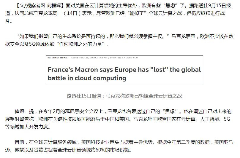 再看看今天的另一則新聞“馬克龍:歐洲已經輸了全球雲計算之戰,但仍應繼續戰鬥”,如圖文:
