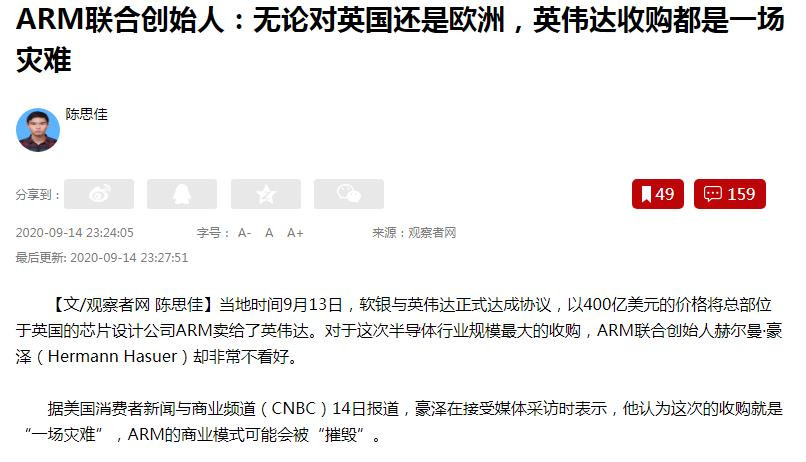今天觀網一早的文章“ARM聯合創始人:無論對英國還是歐洲,英偉達收購都是一場災難”引人關注,如下圖: