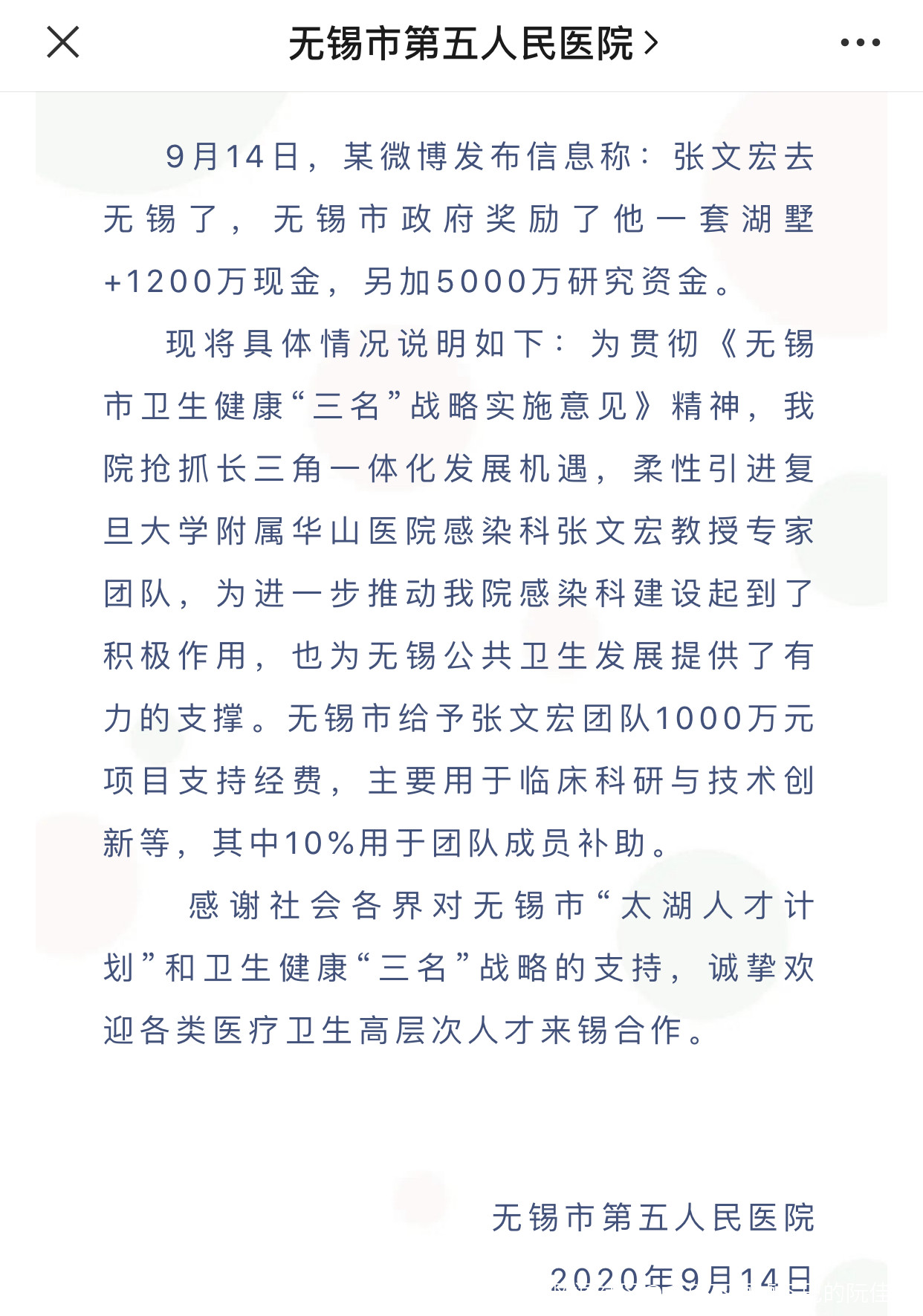9月14日,有微博大V發文稱張文宏醫生去了無錫,並表示無錫市政府獎勵其個人一套太湖別墅、1200萬現金,另加5000萬研究資金。