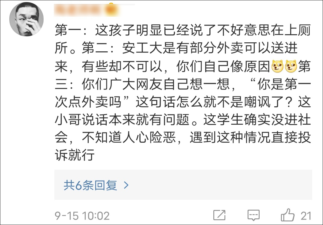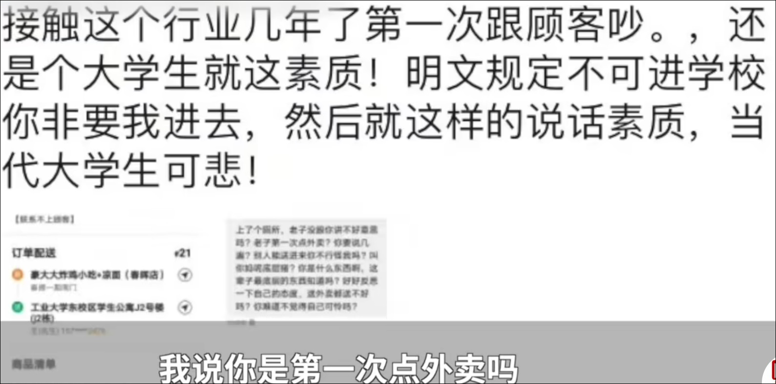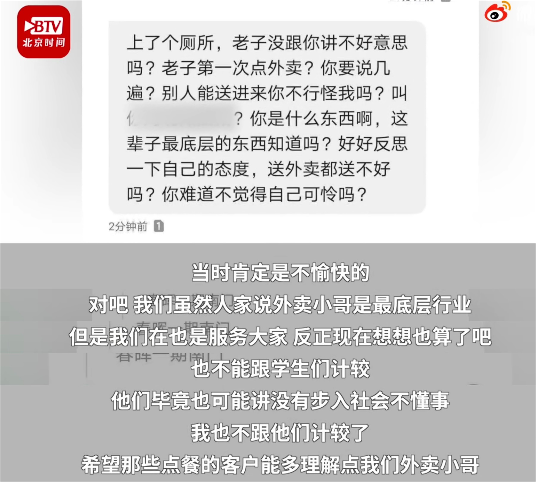 外賣小哥送餐後收到辱罵短信 點餐大學生稱其為“底層豬”_風聞