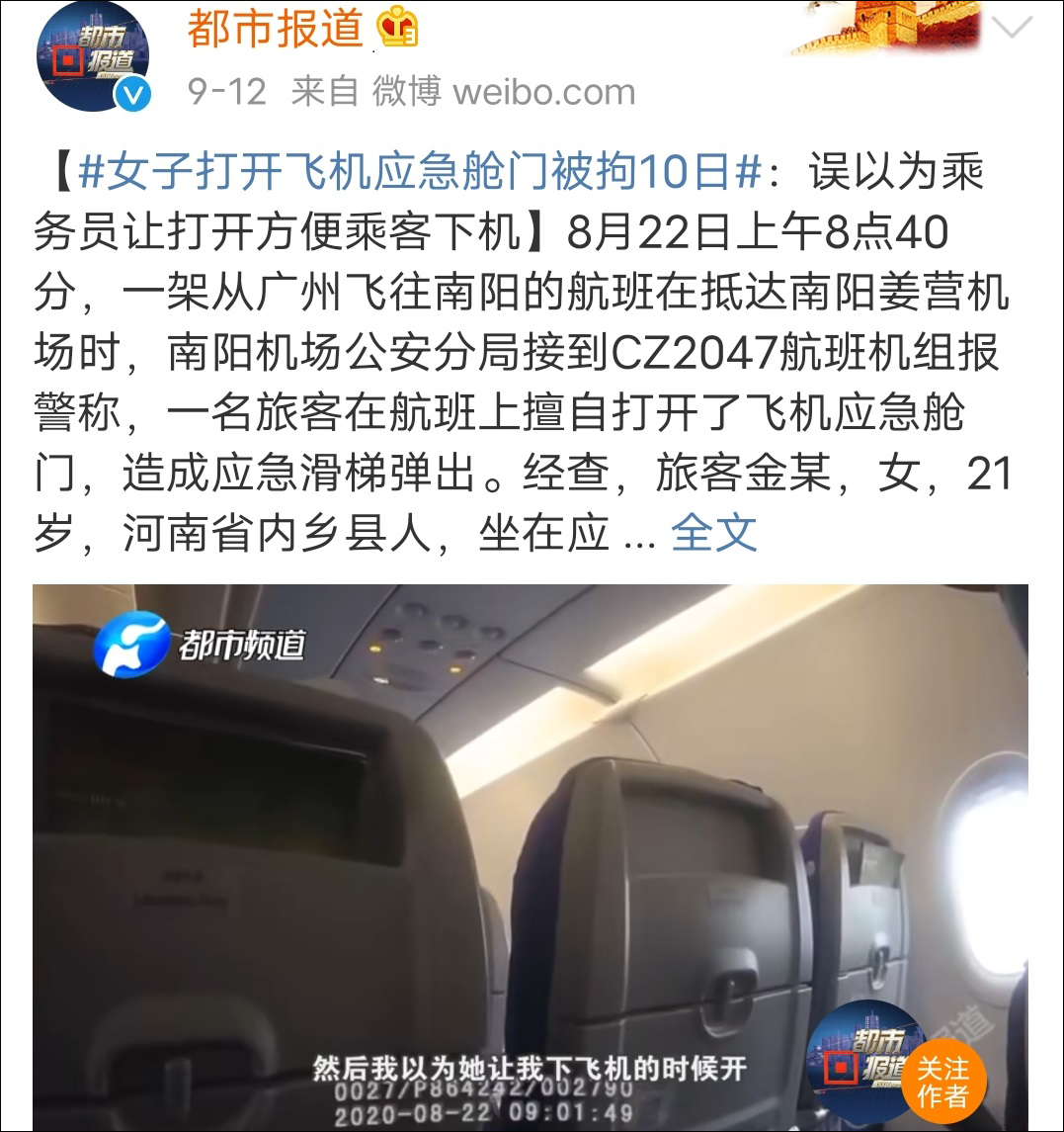 女孩首次坐飛機誤解乘務員意思,打開應急艙門被行拘10日,這個處罰會不會太過了?_風聞
