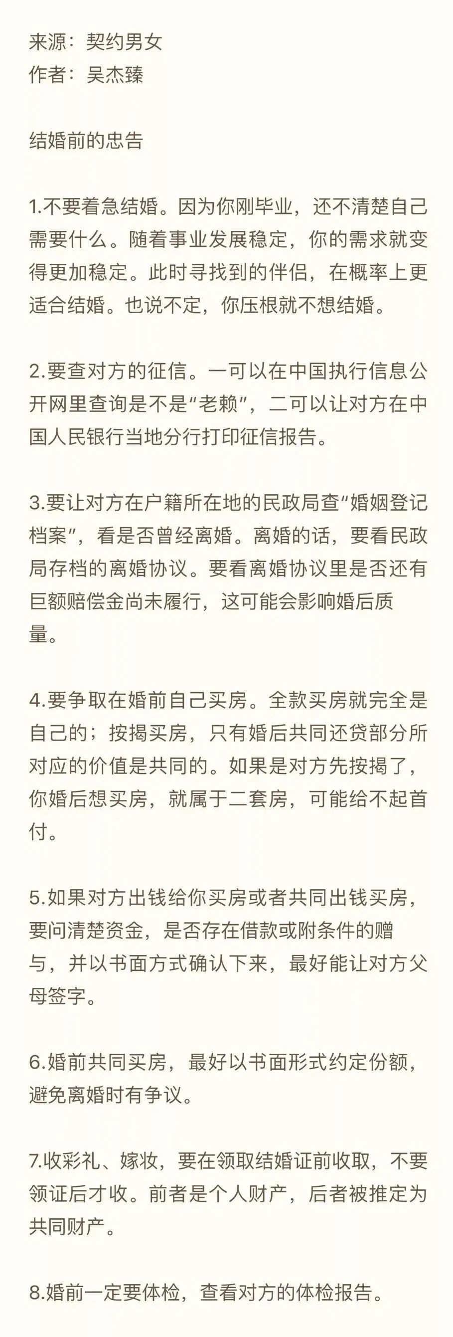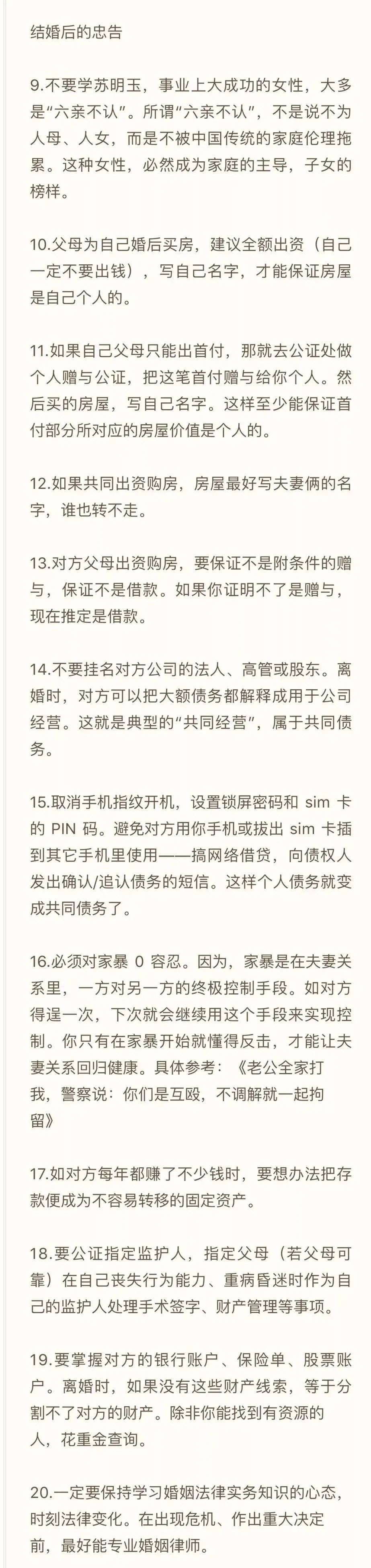 之前曾多次安利給大家的律師**@吳傑臻**教你自保的20條婚姻忠告,希望女孩們一定要牢記心中。