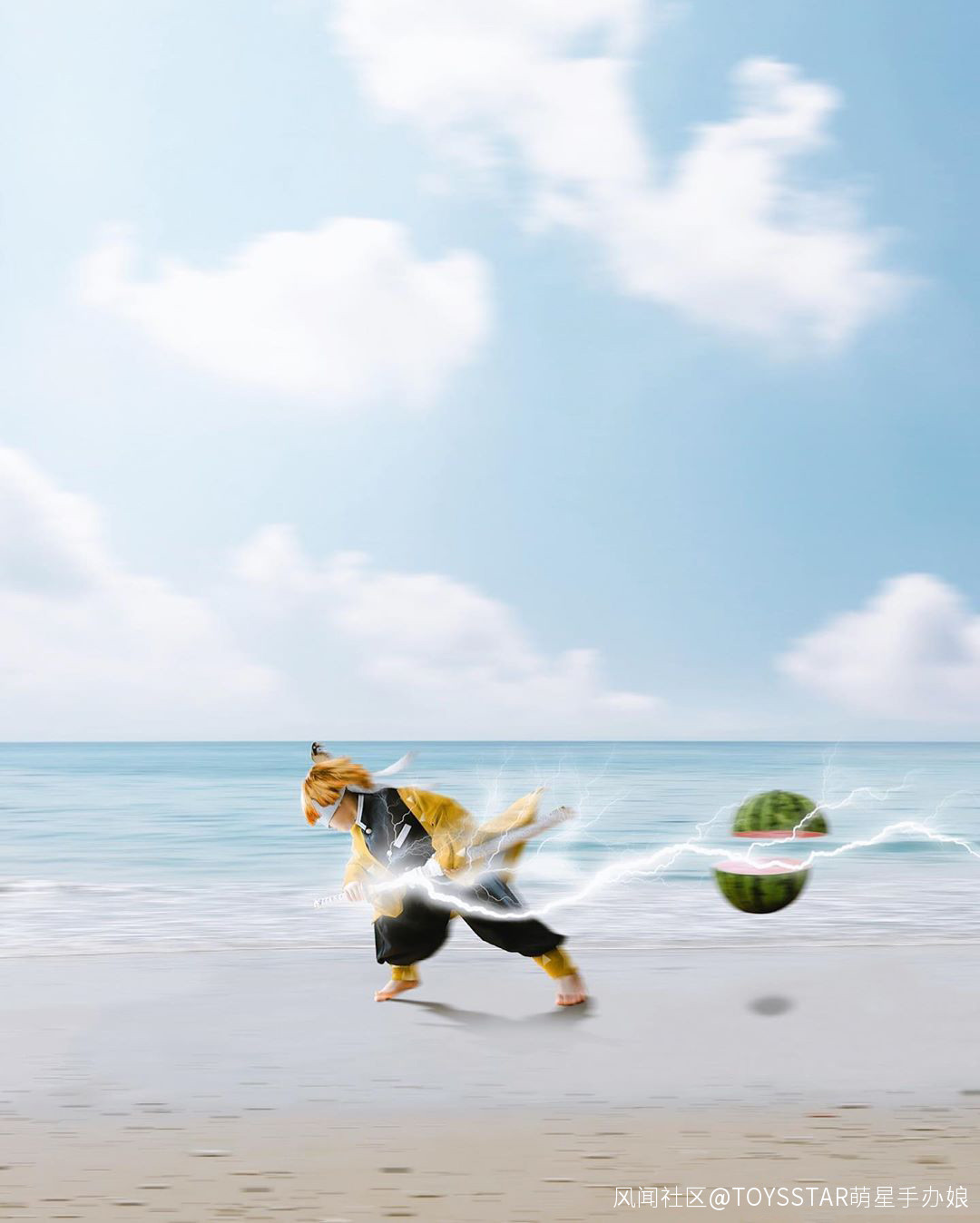 這張我感覺太帥了呢,我妻善逸 使用雷之呼吸,讓西瓜橫切成兩半,那一往無前的姿勢,太酷了,但是我發現,網友特別喜歡將西瓜或切或劈或吃,是因為喜歡吃西瓜嗎?