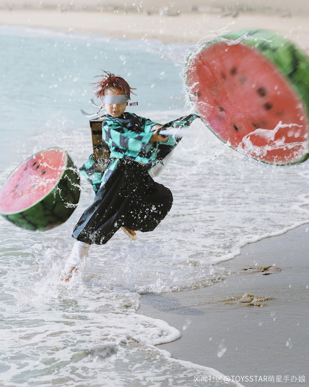 第一張 灶門炭治郎 的cos照片,水花環繞在他的身旁,加上燈光的渲染,簡直就是炭治郎小可愛哇,還有第二張灶門炭治郎矇住眼睛切西瓜的圖片,那濺起的水花,和氣勢,簡直不要太帥了啦!