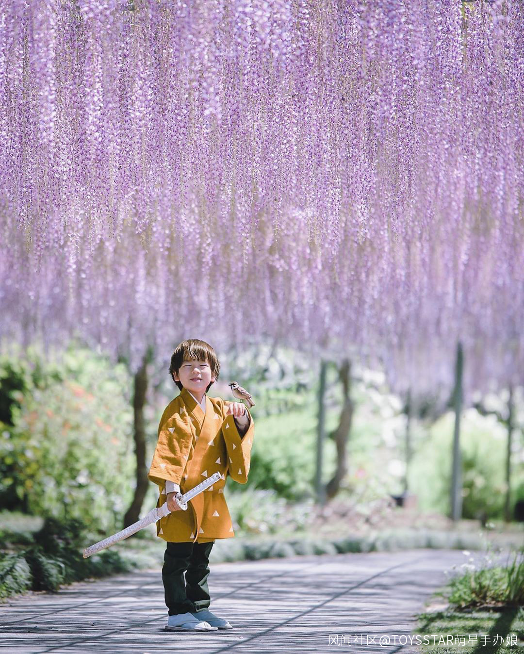 咦,平時消極膽怯的 我妻善逸,笑容好和煦好陽光,剛好有隻麻雀站在他的手上,和紫藤花相得益彰,愈看我是愈姨母笑。