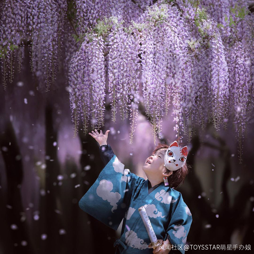 炭治郎帶着 麟瀧左近次 的消災狐狸面具,站在紫藤花之下,手張開舉在上空,花瓣散落下來,真的要多美有多美,還有那淺淺的笑容,太治癒了啦!
